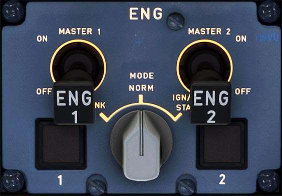 The Engine Panel is used to control and start the engines. It contains Master Switches for each engine and also an Ignition Mode Switch for starting or cranking the engine.