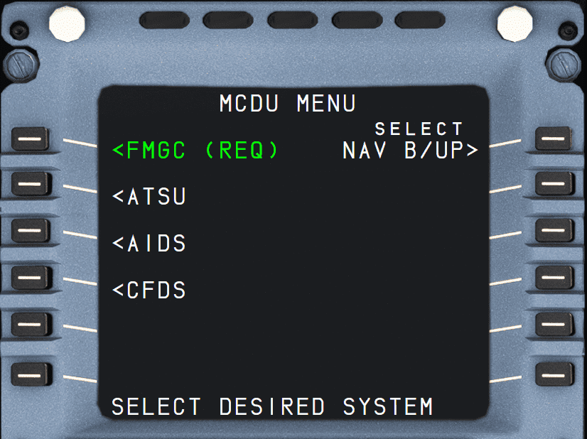 • The MCDU NAV B/UP allows to link a MCDU to its associated IRS in order to allow the flight crew to monitor the navigation and to be provided with some basic flight planning functions in case of FM 1 + 2 failure.