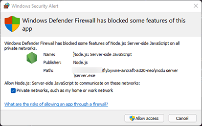Changing Windows settings, especially security settings like the firewall, comes with certain risks. Please do not change these settings if you are not comfortable doing so. FlyByWire Simulations does not take any responsibility for any issues caused by your changes to Windows or security settings.